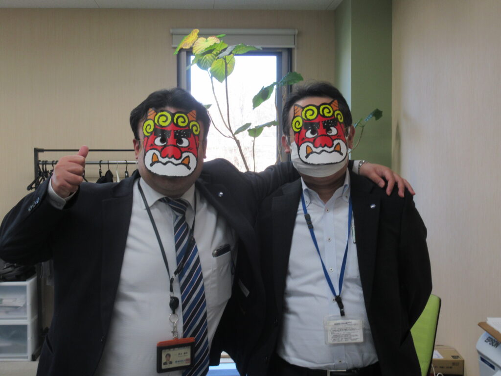 2月3日、当社恒例の豆まき行事を開催しました。 毎年、年男・年女の社員が各部署を巡り、
