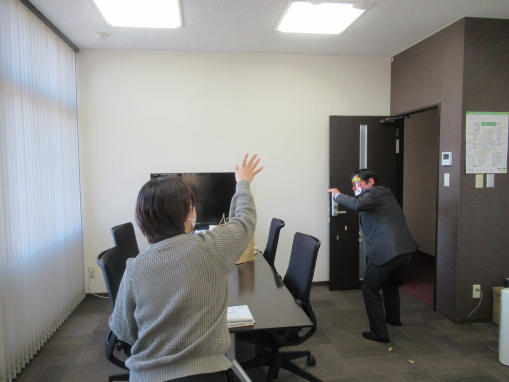 鬼役の社員に元気よく豆をまいて、厄払いと福を呼び込みます。