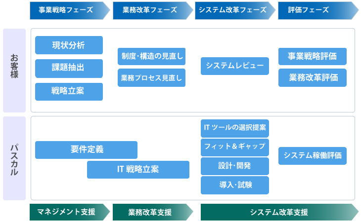 お客様の課題を明確化して分析し、経営戦略推進のための具体的かつ最適な解決方法を導き出してご提案するのが、 パスカルの「ITコンサルティングサービス」です。 またこれにより生じたプロジェクト活動全般についても支援します。